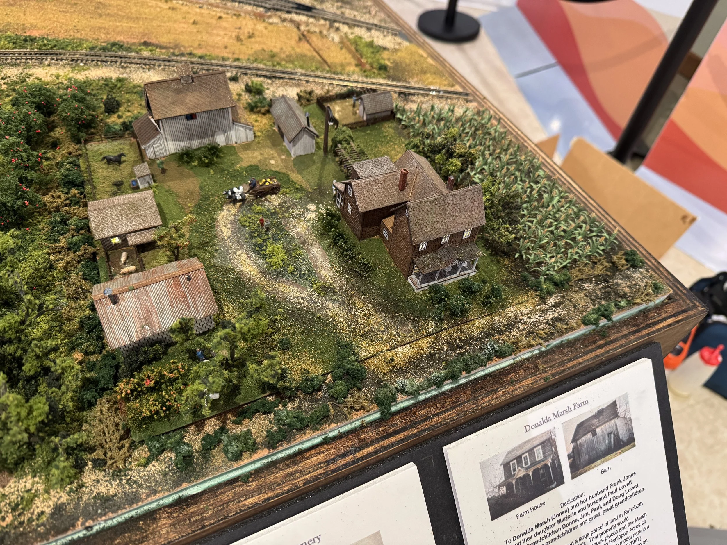 Donalda Marsh Farm as displayed here is an exact recreation of the farm including the barn, grape arbor, and out buildings. The farm model serves as the signature piece of the creator of the diorama, Paul Lovett. (Sponsor: Lovett Family and descendants)